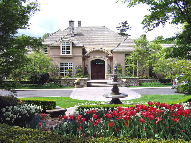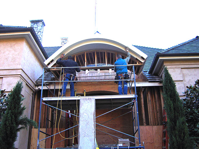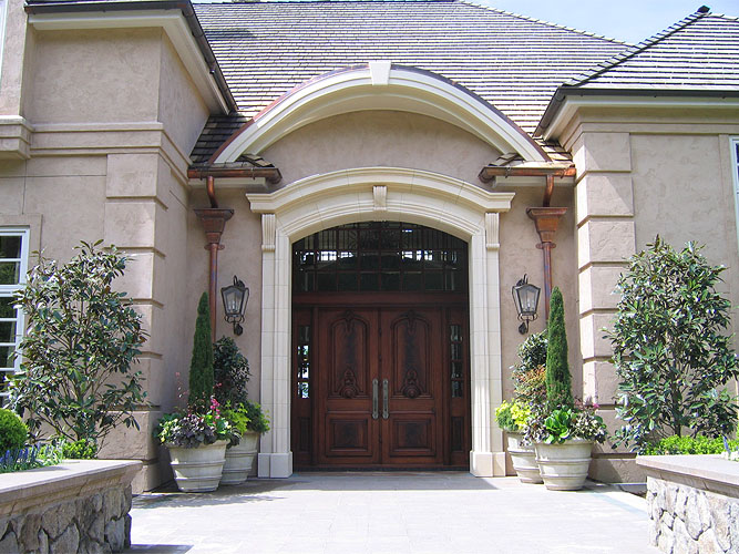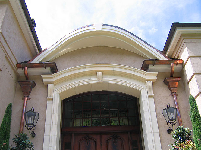 A year after we completed the Woodway Bluff Estate, our client called on us to remodel the entryway using a hand-carved French limestone surround. The complex renovation involved upgrading the existing structure and expanding the entry porch to accommodate the weight and size of the limestone. A new barrel-vaulted copper roof, copper flashing, delicate copper downspouts, and recessed lighting add elegance to the entry. Although the remodel required opening a large hole in the roof, we succeeded in keeping the home dry and free of water damage during a wet November and the biggest windstorm in Seattle history.